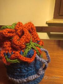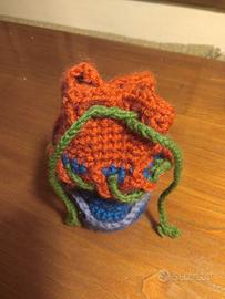 Sacchetto fatto a mano all'uncinetto, chiudibile, con due pratiche bretelle sul retro.