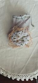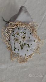 * il fondo è un cuscinetto leggermente imbottito, di forma rotonda e decorato con un ricamo che rappresenta delicati piccoli fiorellini di campo con petali sottili e steli verdi, realizzati con punti di ricamo tradizionali; il tutto incorniciato da un delicato bordino in pizzo color avorio lavorato artigianalmente all'uncinetto che dona un tocco romantico e senza tempo.