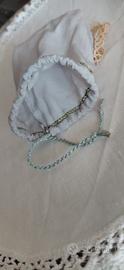 * la chiusura è impreziosita da un cordoncino intrecciato colore azzurro che consente la chiusura a coulisse, da completare con un nodo a fiocco/farfalla