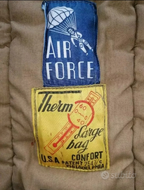 Sacco a pelo militare U.S.A Air Force - Confort Patent 2547/C (Philadelphia). Oggetto risalente al periodo tra il 1950 e il 1960 in dotazione alle truppe Americane in Italia dopo la Seconda Guerra Mondiale. Oggetto usato con visibili segni del tempo/d'usura, vedi attentamente foto (non è stato lavato di recente, presenta piccoli strappi e/o imperfezioni, le cinghie in gomma che venivano usate per tenerlo chiuso sono entrambe rotte). Euro 45.