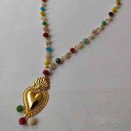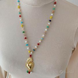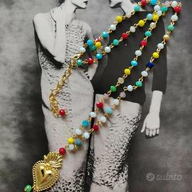 Collana rosario multicolor stile boho folk kitsch con, cuore ex voto e ciondoli vari in cristallo multicolor finitura opaca.