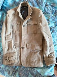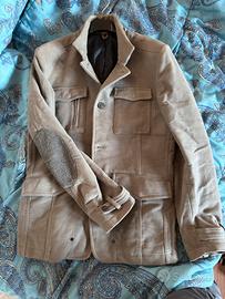 Una giacca sahariana in pelle scamosciata di colore beige/talpa, un capo versatile spesso reinterpretato da marchi di lusso