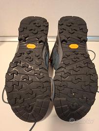 Salewa MS Alp Trainer 2 Mid Gtx in goretex con suola vibram colore blu con dettagli orange. Taglia in foto (46.5). Giro scarpa con fascioni. Ramponabili (con ramponcini). Vendo per errato numero (4/5 uscite, perfette), scatola generica.