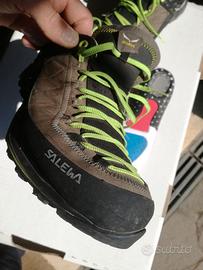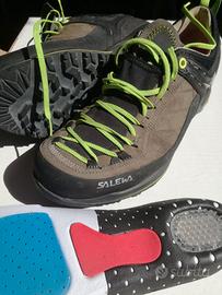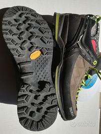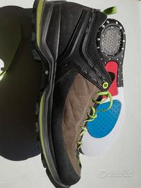 Scarponcini robusti bassi usati per qualche camminata e poi messi da parte per passaggio a scarpe da trail run. In buone condizioni, integri, qualche normale segno di utilizzo nel battistrada. Plantare sostituito con uno anatomico con gel ammortizzante sul tallone