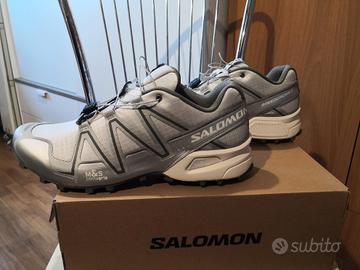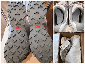 Scarpe Salomon Speedcross 3, tg. 46 nuove al 100% garantito, mai usate, mai indossate, con cartellino attaccato e scatola originale, allacciatura rapida, tomaia in tela color argento e grigio, soletta removibile Hortolite.