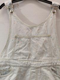 Salopette a pantaloncini in denim, molto chiara tra azzurra e bianca con decorazioni a macchie simili pittura e bianche e strappi sui pantaloncini.