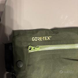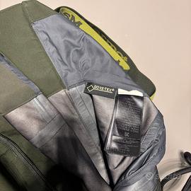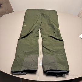 Salopette Marmot in goretex, colore verde scuro, apertura totale gamba con zip termosaldate, ghette incorporate e inserti anti graffio a fine pantalone