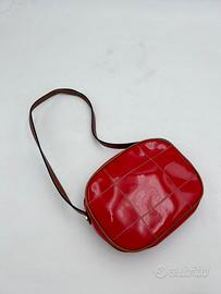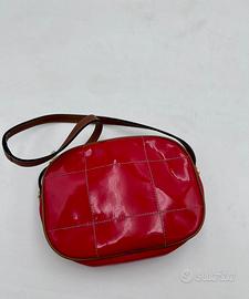 in vernice rossa con manico, bordi e impunture a contrasto marrone. Hardware in metallo dorato.