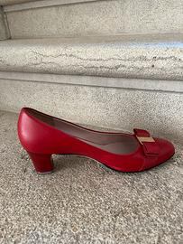 Iconiche décolleté Vara di Salvatore Ferragamo, realizzate in pelle rossa con fiocco in grosgrain e placca dorata con logo inciso.