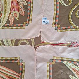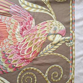 in 100% seta fondo marroncino chiaro con bordo color albicocca e fantasia centrale due grandi uccelli, indossato poche volte in ottime condizione MISURA: 95 X 93 CM