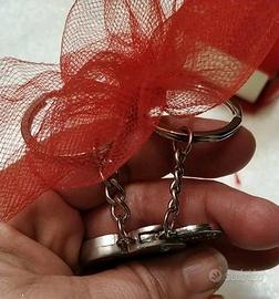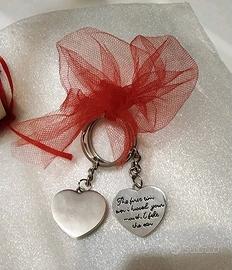 2 portachiavi in acciaio con ciondoli a forma di cuore che si inseriscono uno dentro l'altro.