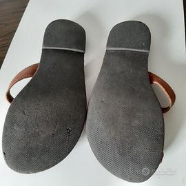 La tomaia è un po' sbiadita e nel sandaletto di destra è saltato qualche punto di impuntura, come da foto.