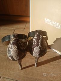 Eleganti e sofisticati, questi sandali con tacco alto firmati Michael Kors sono il dettaglio perfetto per completare un outfit ricercato. Realizzati con finitura effetto pitone e fascia in pelle nera, uniscono carattere e raffinatezza. Il design con cinturino alla caviglia garantisce stabilità e slancia la figura, rendendoli ideali sia per un evento speciale che per una serata chic.