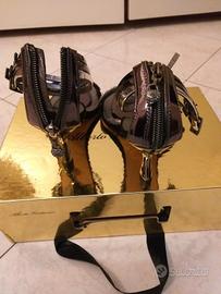 Bellissimi sandali coi cristalli marca Alberto Venturini, taglia 37, tacco 7,5 cm, color grigio metallizzato tempestati di cristalli bianchi, neri e grigi. Cinturini laterali, cerniera con cuoricino tempestato di cristalli dietro. I cinturini hanno colorazioni da argento a nero in pendant con la parte davanti dove ci sono i cristalli con vari colorazioni. Prodotto NUOVO