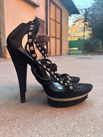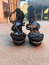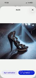 Sandali con tacco alto e plateau, colore nero, decorati con strass luminosi lungo i cinturini. Modello molto elegante e d’impatto, perfetto per serate, eventi o occasioni speciali. 💎 Dettagli con strass 👠 Tacco alto con plateau (comodi rispetto al tacco pieno) 🎀 Chiusura alla caviglia 🖤 Colore nero, facilmente abbinabile Condizioni: buone, normali segni di utilizzo (vedi foto).