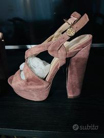 Vnedi sandali estivi in camoscio color risa cipria, tacco alto 13 cm e zeppa davanti alta 3 cm.