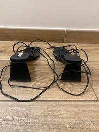 Eleganti sandali neri con un design unico. - Lacci lunghi che arrivano fino alle caviglie e ai polpacci - Tacco a piramide per un look moderno. - Dettagli dorati sui lacci. - infradito - tacco 7 cm -taglia 37