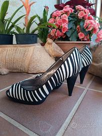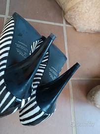 Sandali décolleté open toe marca britannica AUTOGRAPH M&S Marks and Spencer Insolia n.38 (suola interna 24,5*8 cm), tacco 9 cm Plateau 1 cm, in pelle verniciata e setole tipo cavallino, zebrate in bianco/ nero.