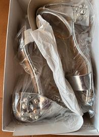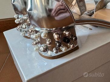 Elegante sandalo Ovye in pelle laminata di un bellissimo e brillante argento effetto specchio con tacco largo alto 4,5 cm rivestito di perle di varie colorazioni Punta arrotondata con fascia, chiuso dietro e con cinturino regolabile alla caviglia Suola in cuoio e soletta interna in vera pelle Modello molto bello ed elegante indossato solo per un evento in perfette condizioni, ma preso misura piccola Numero 36