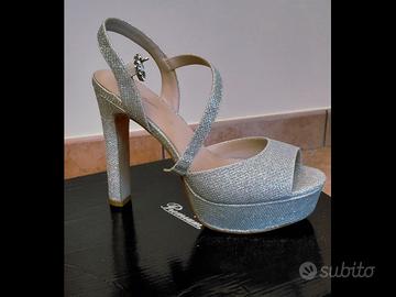 Sandalo TATA Argento Glitterato numero 40, ma vestono bene anche un num 39. MAI INDOSSATI. NUOVI. Tacco largo h 14 cm, comodissimi perchè presente plateau di quasi 4 cm. Acquistati a €70 vendo a €40.