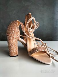 Vendo sandali con lacci alla schiava in vera pelle n 38 tacco 12 cm usati solo una volta color rosa /oro con brillantini