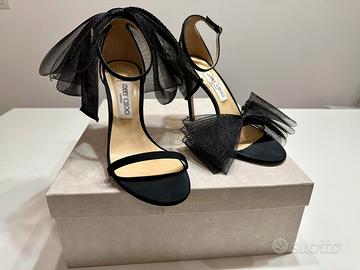 Sandali di colore nero con fiocchi asimmetrici Aveline di Jimmy Choo. Modello con punta tonda, suola con logo, chiusura alla caviglia con fibbia e tacco a stiletto alto. Con dust bag.