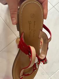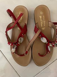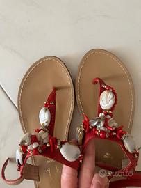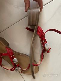 Sandali rossi impreziositi con coralli e perline rosse, alti, Antica Sartoria, pari a nuovi. Di cuoio rigido