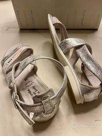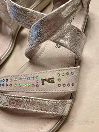 Vendo sandali da bambina NeroGiardini Junior, numero 33, colore argento con dettagli luminosi in strass.