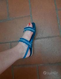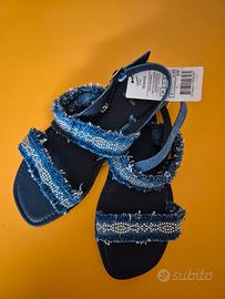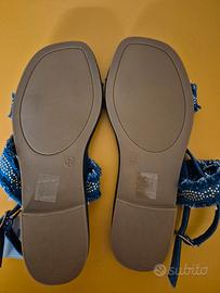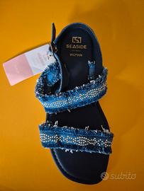 Sandali bassi donna Seaside in jeans doppia fascia, decorati con perline in metallo, Nr. 36. Nuovi con cartellino senza scatola.