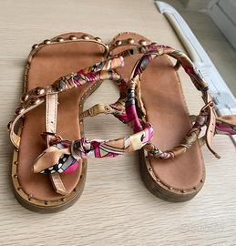 Sandali estivi in cuoio con cinturino decorato con borchie dorate e tessuto a fantasia floreale e colori vivaci. Molto comodi, in perfette condizioni, come nuovi. Taglia: 40