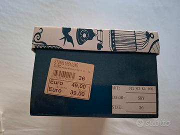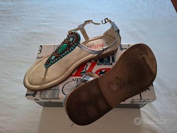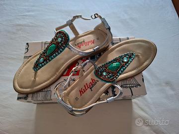 Sandali usati una sola volta, color argento con pietre decorative azzurro, verdi. Estensione del cinturino alla caviglia per agevolare la chiusura.