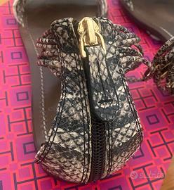 sandali bassi Tory Burch, in pelle rettile e inserti in metallo color oro. Cinturino dietro il tallone, Numero 38. In dossati una sola volta, non presentano segni di usura né difetti, macchie o graffi. Con dust bag (foto finale) di cotone e chiusura con logo. Solo la scatola è un po' rovinata in un angolo.