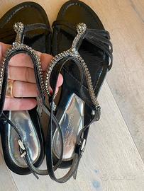 Sandali in vernice nera con strass, bassi, tacco a scivolo 1 cm. Numero 37. Marca: Guglielmo Rotta