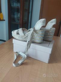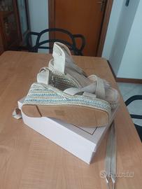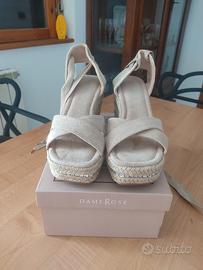 Sandali alla schiava donna color beige con il tacco in corda e strass inseriti, altezza cm 10, misura 38. Nuovi, MAI indossati.