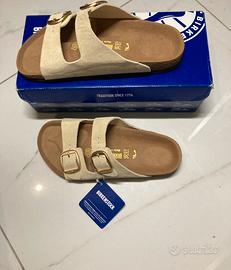 Ciabatte Birkenstock modello Arizona in colore beige chiaro con doppia fibbia regolabile dorata. Plantare anatomico in sughero rivestito in pelle scamosciata