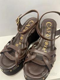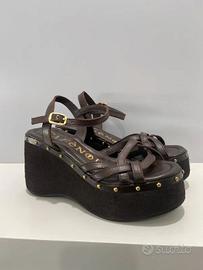 Sandali modello gilda in pelle con listini intrecciati e zeppa rivestita. Fodera e soletto in pelle. Tacco alto 9 cm e plateau di 4.5 cm. Mai usati N.37