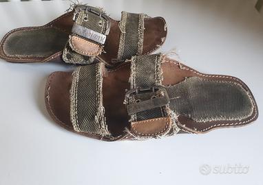 Sandali da uomo Cafe' Noir in cuoio e lino verde militare, usati ma ancora in buono stato. Modello molto particolare e raro.