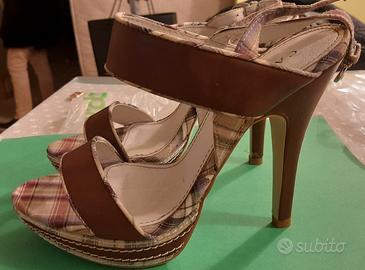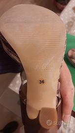 taglia 36, in pelle, comodissimi grazie al plateau e alla cinghietta alla caviglia