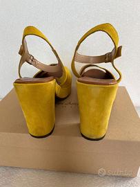 Sandali in camoscio con plateau e cinturino,N.39 colore giallo ocra Tacco H.cm.10 Made in Italy-Bottega artigiana usati pochissimo,praticamente nuovi.