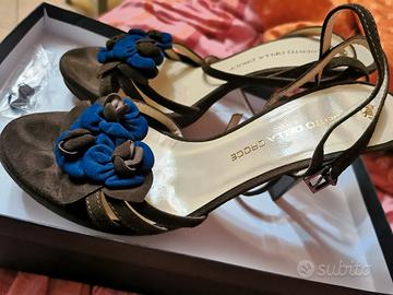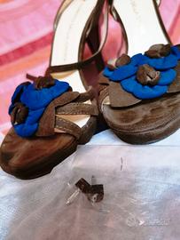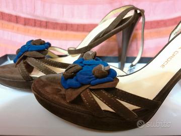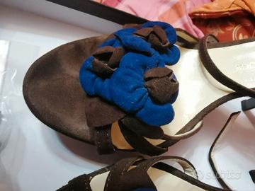 Sandali in camoscio color t.moro/blu Roberto della croce con il cinturino lungo da legare ad incrocio.