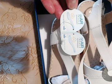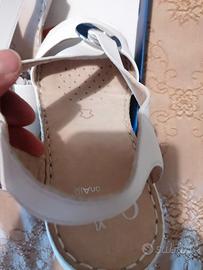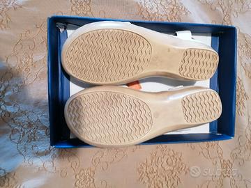 Mai usati, ancora con cartellino e scatola originale. In pelle, con plantare morbido e traspirante, piccola zeppa, applicazione metallica sul davanti e cinturino con elastico.