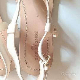 Sandali Car Shoe bassi in pelle di colore bianchi con inserti brige. Chiusura con fibbia regolabile laterale suola in cuoio con gommini . Usati pochissimo come si vede dalle foto