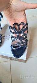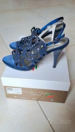 Sandali in raso blu con brillantini, taglia 36, tacco 10 cm, in vero cuoio. Marca: Giulia & Fabio Firenze, Made in Italy.