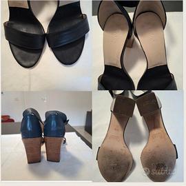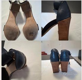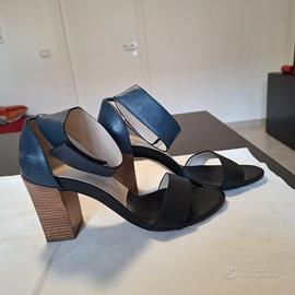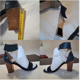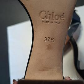 Sandali Chloé bicolor blu (tallone e allacciatura) e nero (parte anteriore) Allacciati alla caviglia con velcro. Tacco da 8 cm, numero 37,5 IT. Lievi segni d'uso sul tallone e un minimo segno su una delle 2 parti elastiche di collegamento dell'allacciatura, tutti visibili in foto e quasi impercettibili da indossate. Nessun segno nella parte frontale. No scatola, no dustbags.