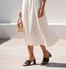 Eleganti e comodi sandali a ciabattina con tacco basso, largo e comodo, by Pollini Tomaia 100% pelle con brand logo sulla fascia Colore nero Prezzo retail €290,00 N.41 PRODOTTO IN ITALIA Prodotto di provenienza italiana, sinonimo di qualità e creatività. COMPOSIZIONE Pelle MISURE Altezza tacco 7 cm DETTAGLI Sandali Tinta unita Pelle, Interno in pelle, Suola in cuoio Punta quadrata Tacco squadrato Brand logo
