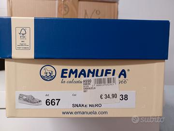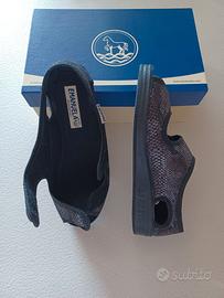 In tessuto con doppio strappo, colore nero e argento con suola piatta. Misura 38. Nuovi mai indossati, in confezione originale.