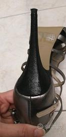 Bellissimo sandalo con plateau marca Liu Jo in vera pelle, tacco 10,5 cm, piccolo gioiello alla chiusura col cinturino laterale, colore grigio medio metallizzato. Il tacco e la parte nera ha un tipo di pelle con una lavorazione particolare tipo fantasia serpente. Indossato 2 volte.