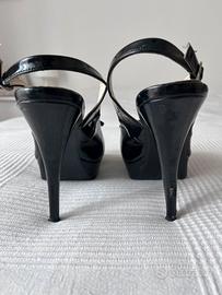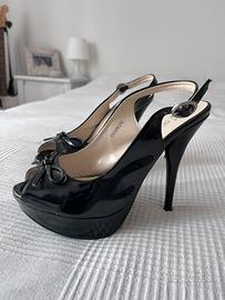 Sandali in oelle lucida nera, con plateaux 3,5 cm, fiocchetto davanti e tacco sottile cm 12. Usate, hanno qualche sgraffio sul tacco.