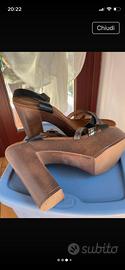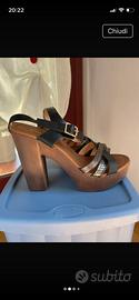 Sandali con tacco alto e plateau, eleganti e molto stabili. Modello con tacco effetto legno, cinturino alla caviglia regolabile con fibbia dorata e fasce anteriori nere con dettaglio metallizzato effetto pitonato. Marca Sweet Shoes, numero 39. Usati pochissimo, in ottime condizioni.
