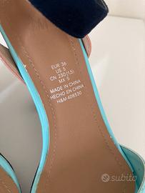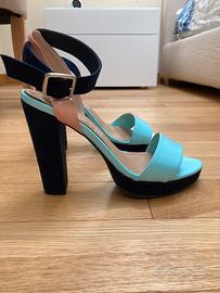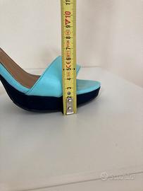 Indossati solo un paio di volte. Color Tiffany, deliziosi! Il tacco e il laccio alla caviglia sono rivestiti simil camoscio di colore blu scuro. N. 36